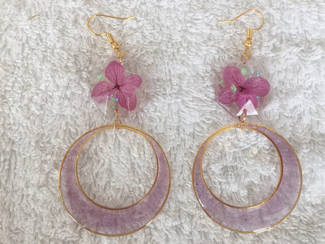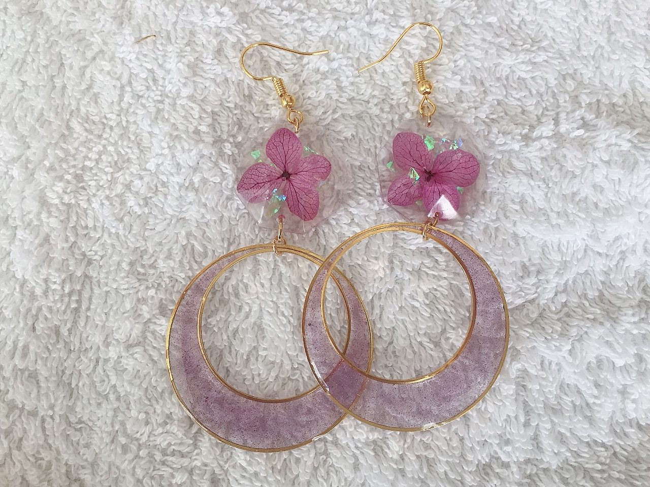 Nos boucles d'oreilles pendantes sont réalisées en deux parties, la première est réalisé en résine recouvrant une fleur séché et naturelle surmontant un anneau contenant de la résine colorée couleur rose.