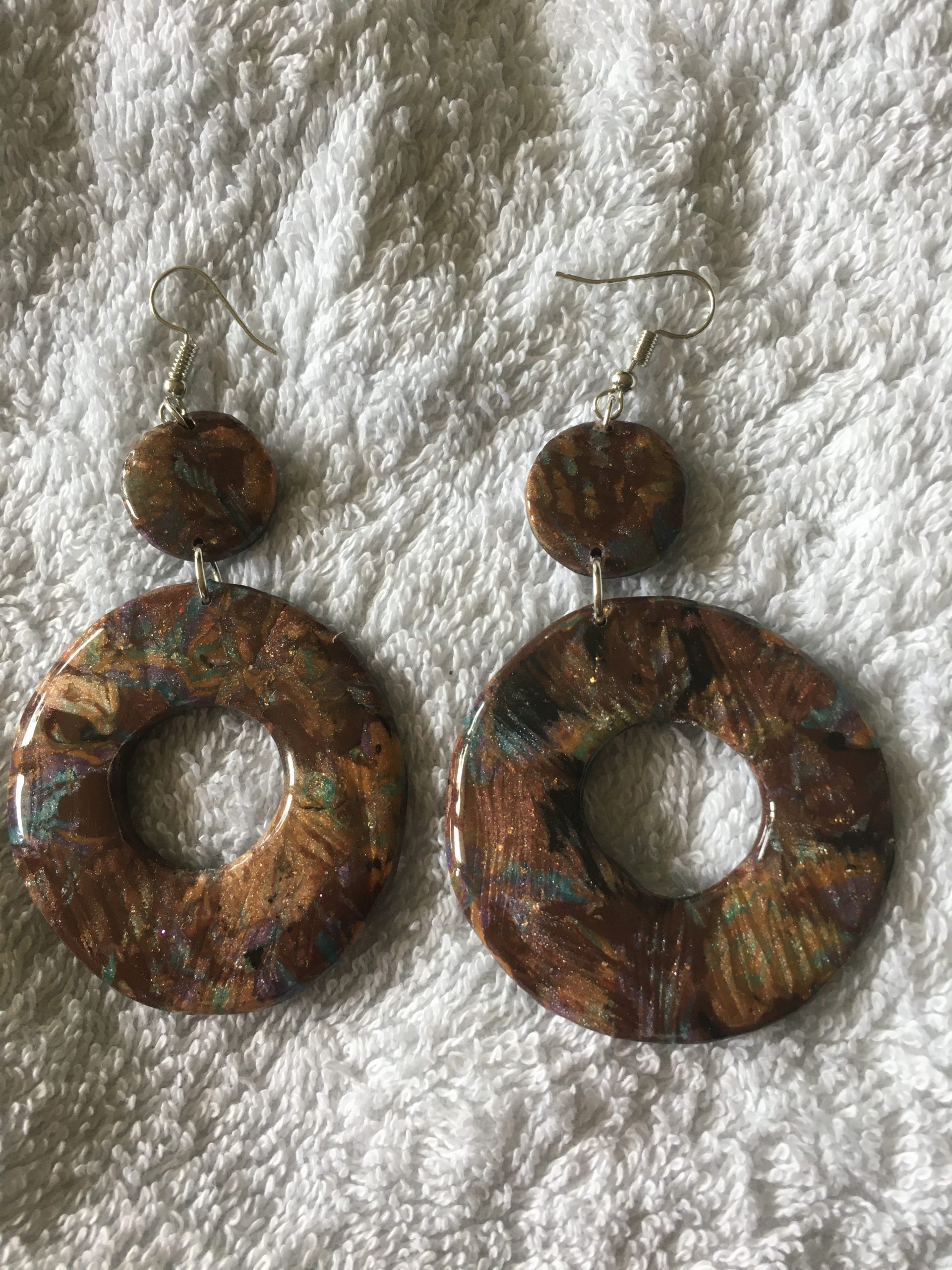 Nos boucles d’oreilles faits main en argile polymère marron, sont constituées de plusieurs couleurs dont le marron est prédominant. La technique de mélange des différentes pate rende ces boucles d'oreilles unique. Elles mesures 70x50mm et pèse 9grammes. Pour leur donner un aspect brillant comme du verre et améliorer la longévité de celles-ci un vernis