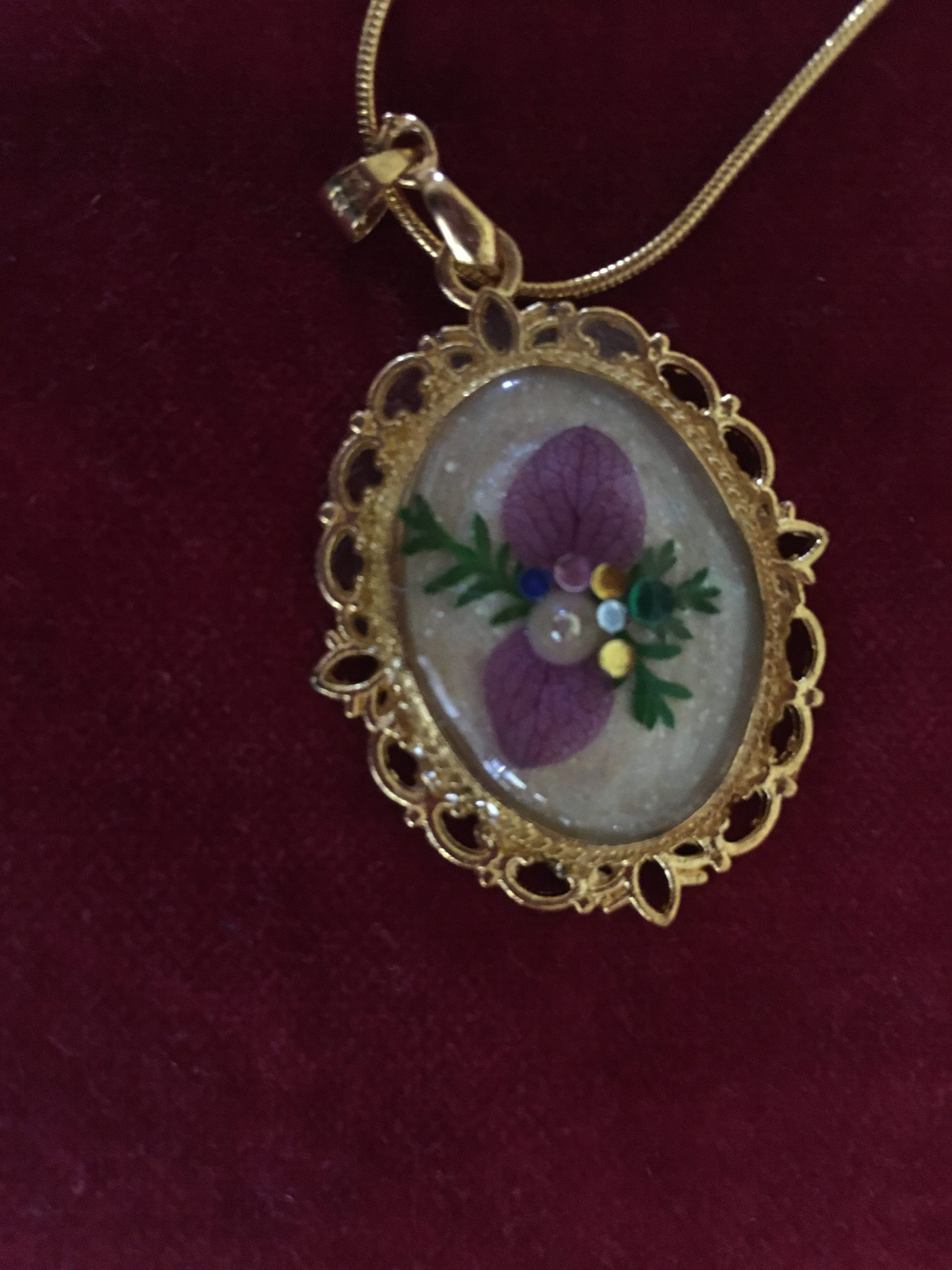 Pendentif doré avec fleur, strass et réalisé en résine est fait main et fabriqué en France par Agnes en personne.. La technique de mélange des différentes teintes rendent nos réalisations unique.